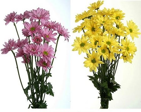- Daisy Poms: Flowers have rounded heads in a spray of about 3 to 5 primary blooms, and usually have a number of smaller, less mature secondary blooms. AVAILABLE COLORS: ASSORTED, YELLOW, WHITE, LAVENDER, ORANGE, BRONZE, RED, BURGUNDY, PURPLE, HOT PINK & LIGHT PINK.