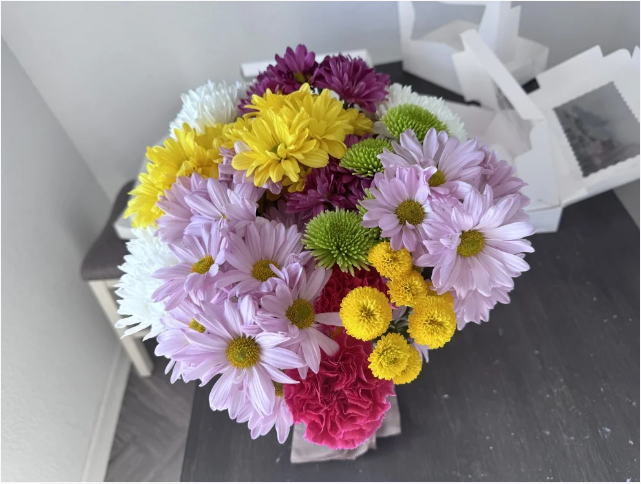 Daisies are shipped with 8 to 10 stems per bunch and are bundled together by a rubber band and placed in a clear plastic sleeve.